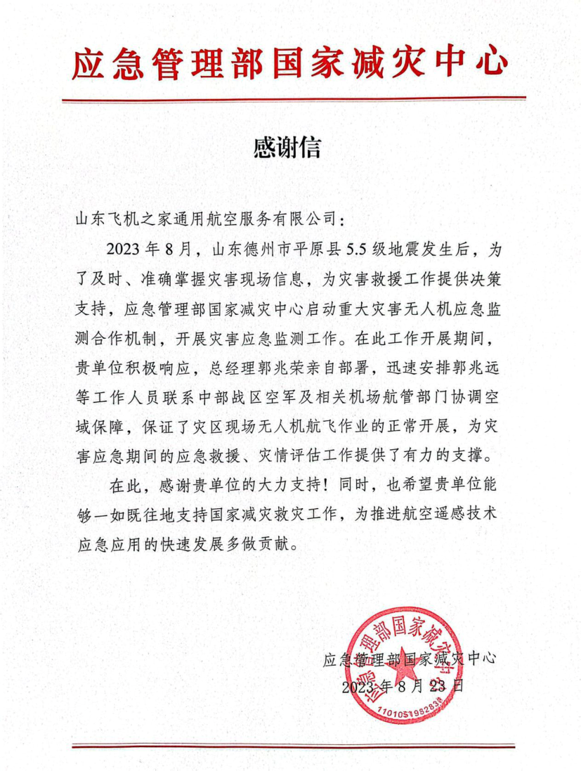 1.2023 年 8 月,山东德州平原县 5.5 级地震,飞机之家及时准确掌握受灾现场信息,为救援工作提供支持,受到了领导的一致认可,事后,一封感谢信飞到了公司内部: