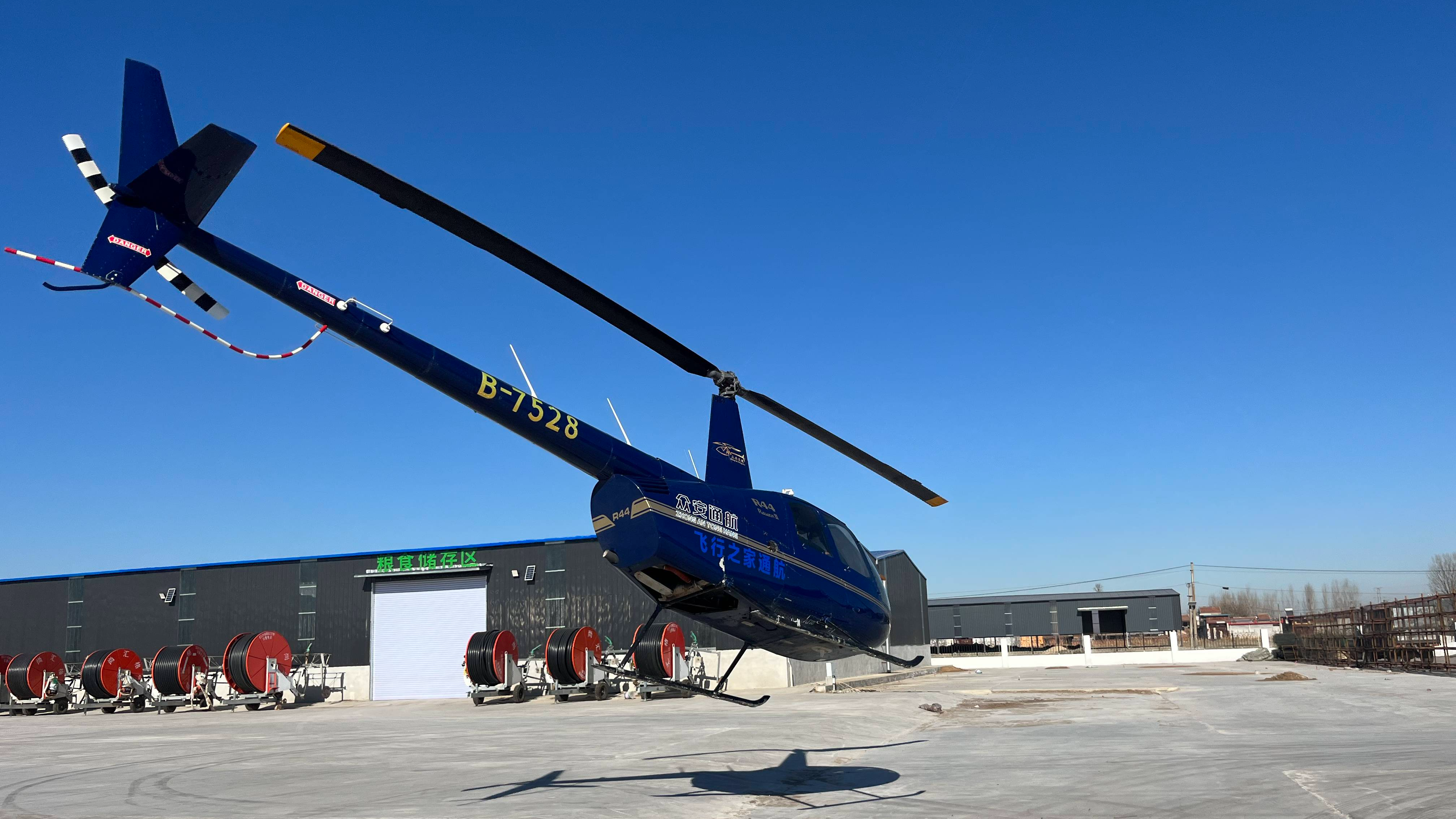 恰逢午时。飞行员,地勤人员,机务人员都在雪野湖等待甲方的电话,突然的铃声敲响了飞机起飞的序幕,起飞前的检查早就做好了,两名地勤人员上了R44直升机,只听见螺旋桨的转速越来越快,风力越来越大,地面上的灰尘都被吹起,刹那间直升机拔地而起飞向空中,直线抵达章丘目的地。