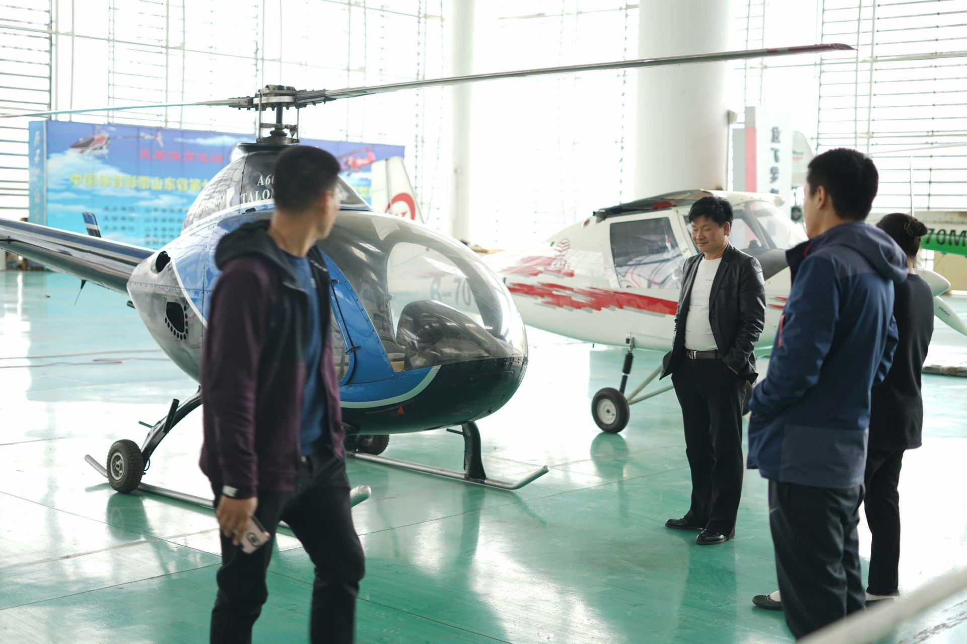 在山东济南高铁西站公司会客室作短暂交流后,一行来到位于莱芜市北部的雪野湖,这里风景优美也是是旅游的胜地。汽车飞驰在全程高速上,大约1小时左右,工作人员和客户便来到了飞机展厅。谈笑间便走进了飞机展厅,眼前的一幕令客户们惊叹不已,一排排的直升机五颜六色展现在了他们面前,以新的风景冲击着适才欣赏雪野湖的视觉。