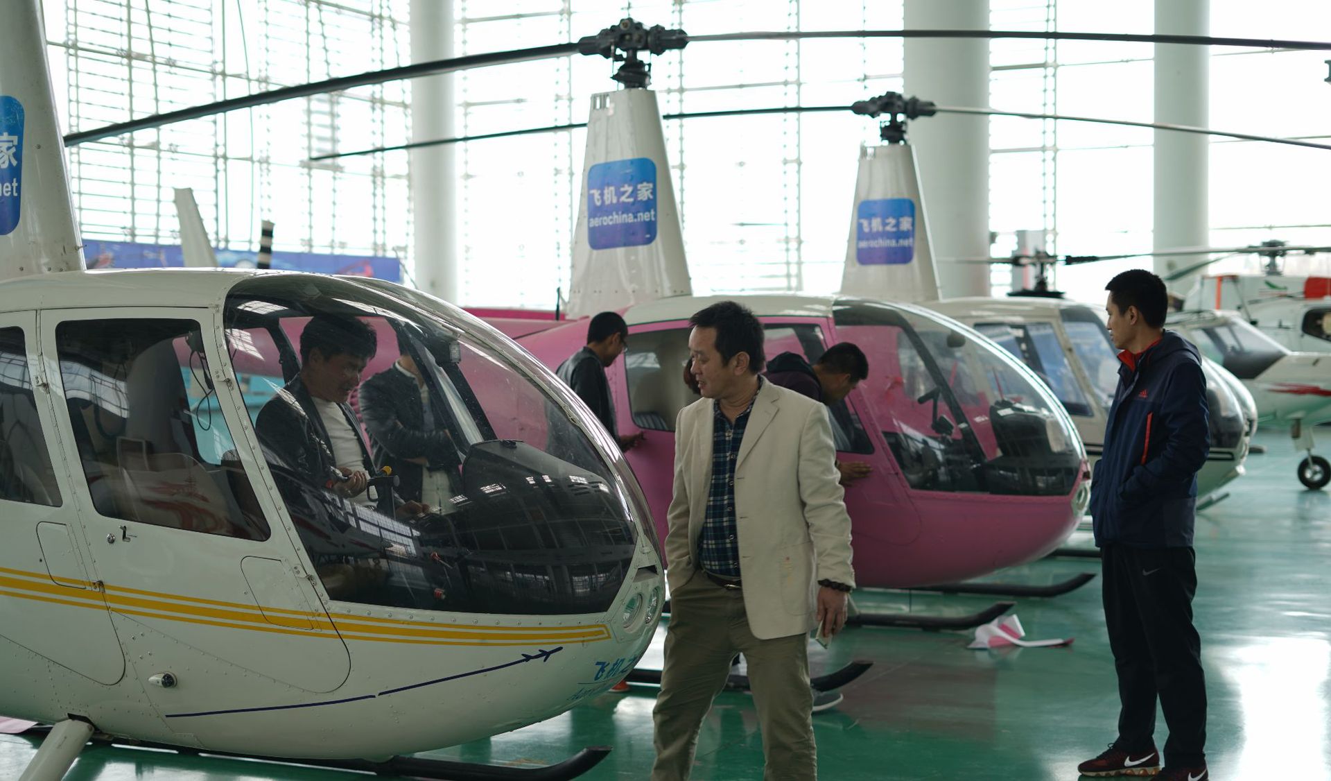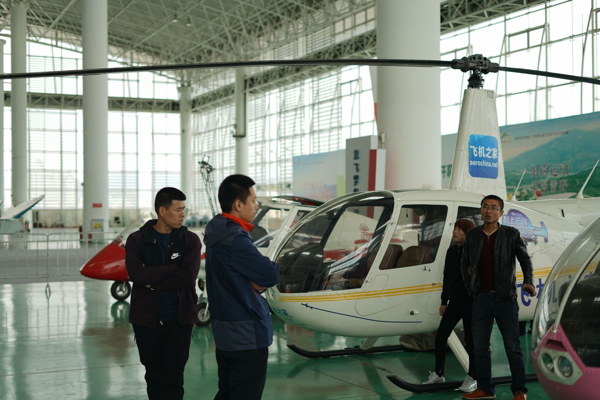展厅特别的宽广,工作人员陪同客户逐一介绍了每架直升机的功能、价格及后期的维护保养等知识,现场的客人都笑容盈盈聚精会神听着工作人员的介绍,还了解了直升机工作中要注意的事项。