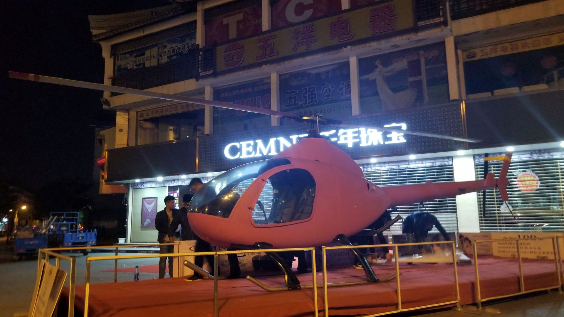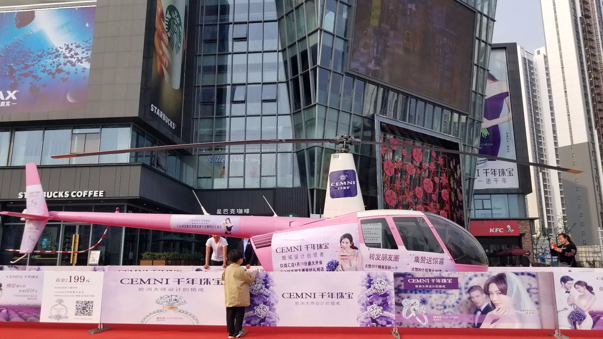 该店四周都是品牌店,双目直视便见星巴克咖啡,恰好一架飞机正好坐落在该店门前。直升机的两侧和机尾都帖上了CEMNI千年珠宝的策划广告,阳光和煦下一小男孩站在直升机前喃喃自语读着上面文字,他的身后有很多人在不断的拍照,该小孩称自己从未这么近距离见过直升机并且上面还有文字。