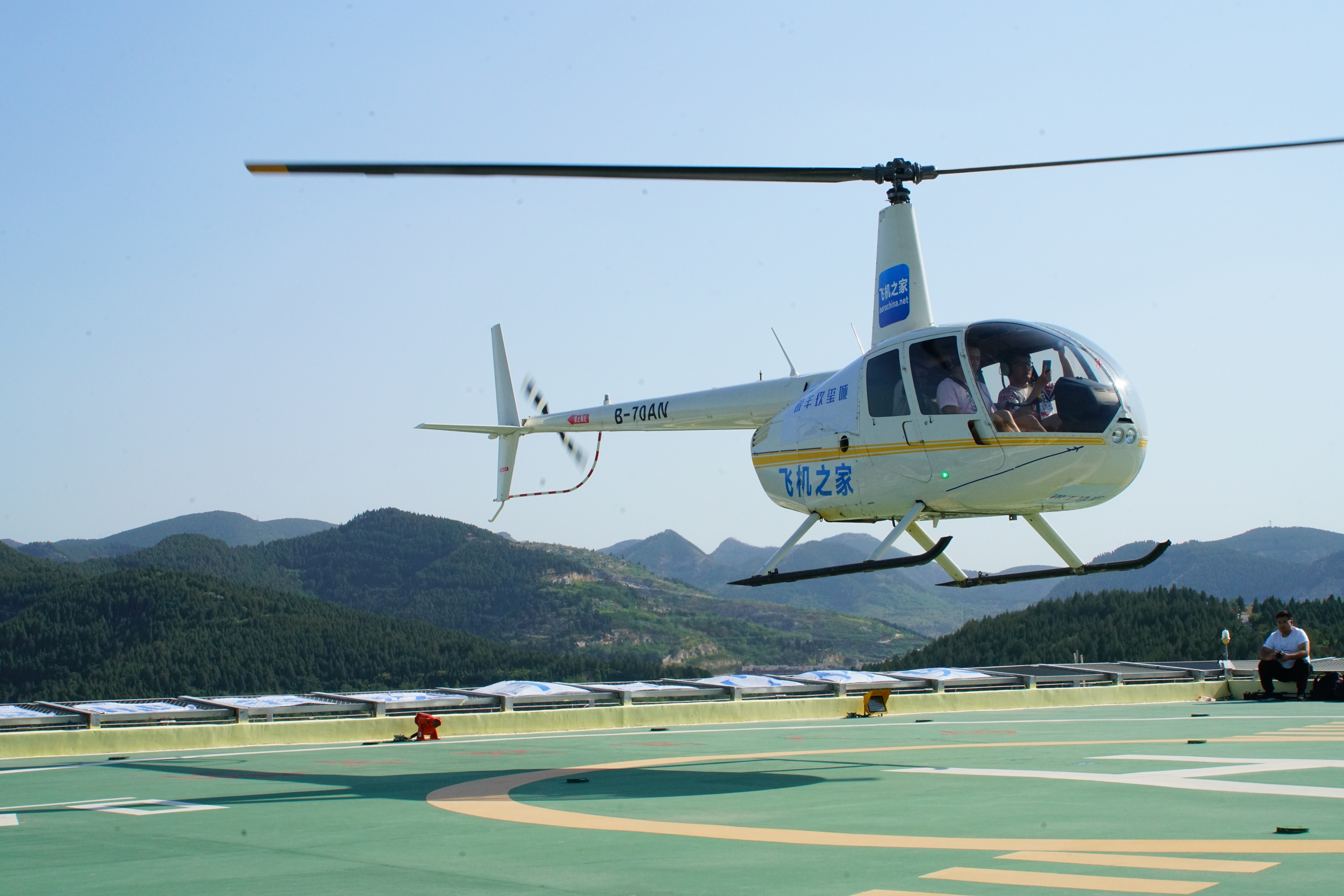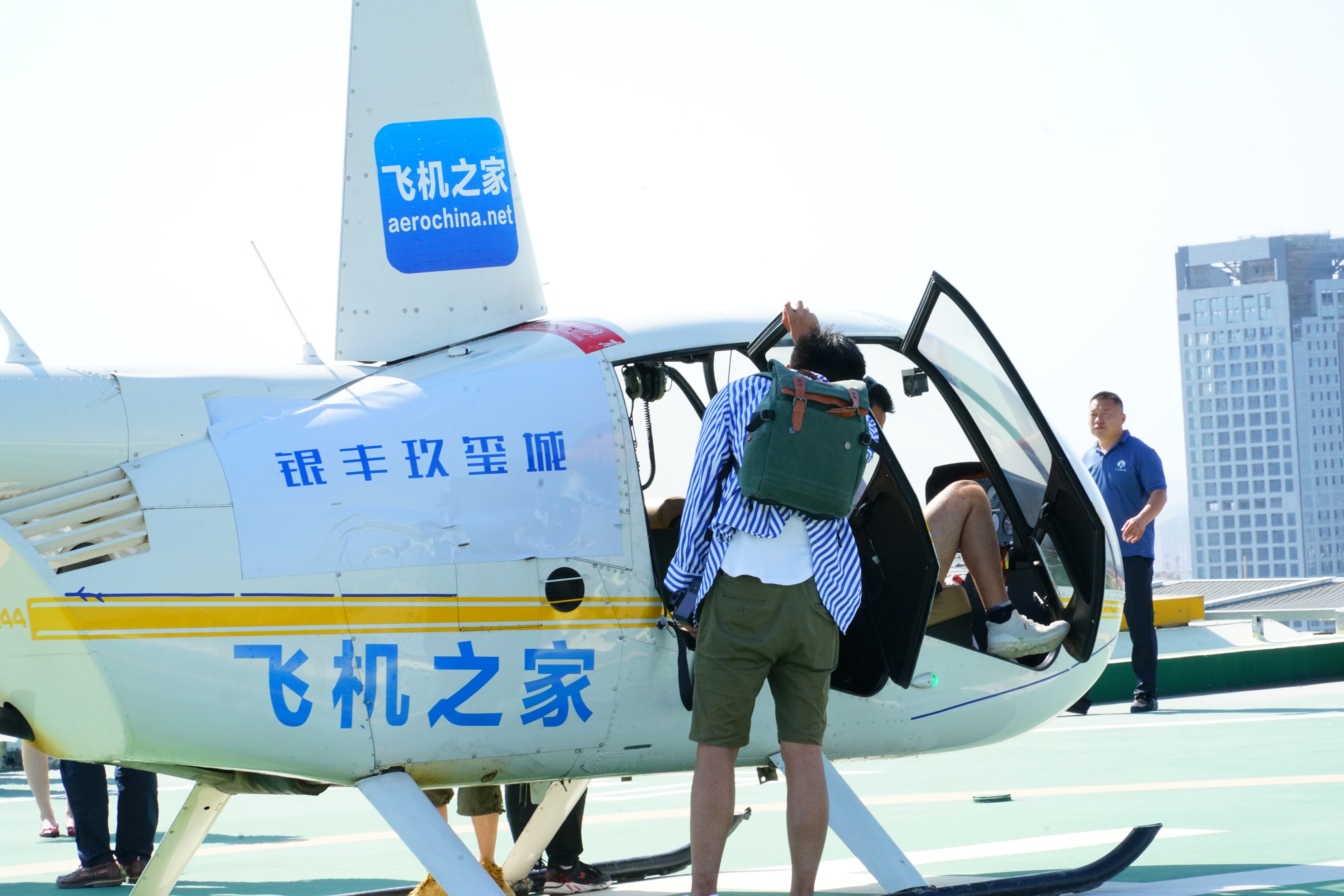 2019年6月9号,飞机之家迎来了节假日最忙时刻,此行飞行是济南CBD银丰楼顶停机坪起飞。一瞬间,来了一架白色罗宾逊R44,在空中盘旋一会,慢慢落到楼顶。这一天可谓晴空万里,只是太阳的照射稍强一些。早晨时刻,不省心的天气开始慢慢变热起来,幸有直升机螺旋桨的旋转作为大的风扇是送给现场人员最好的礼物。