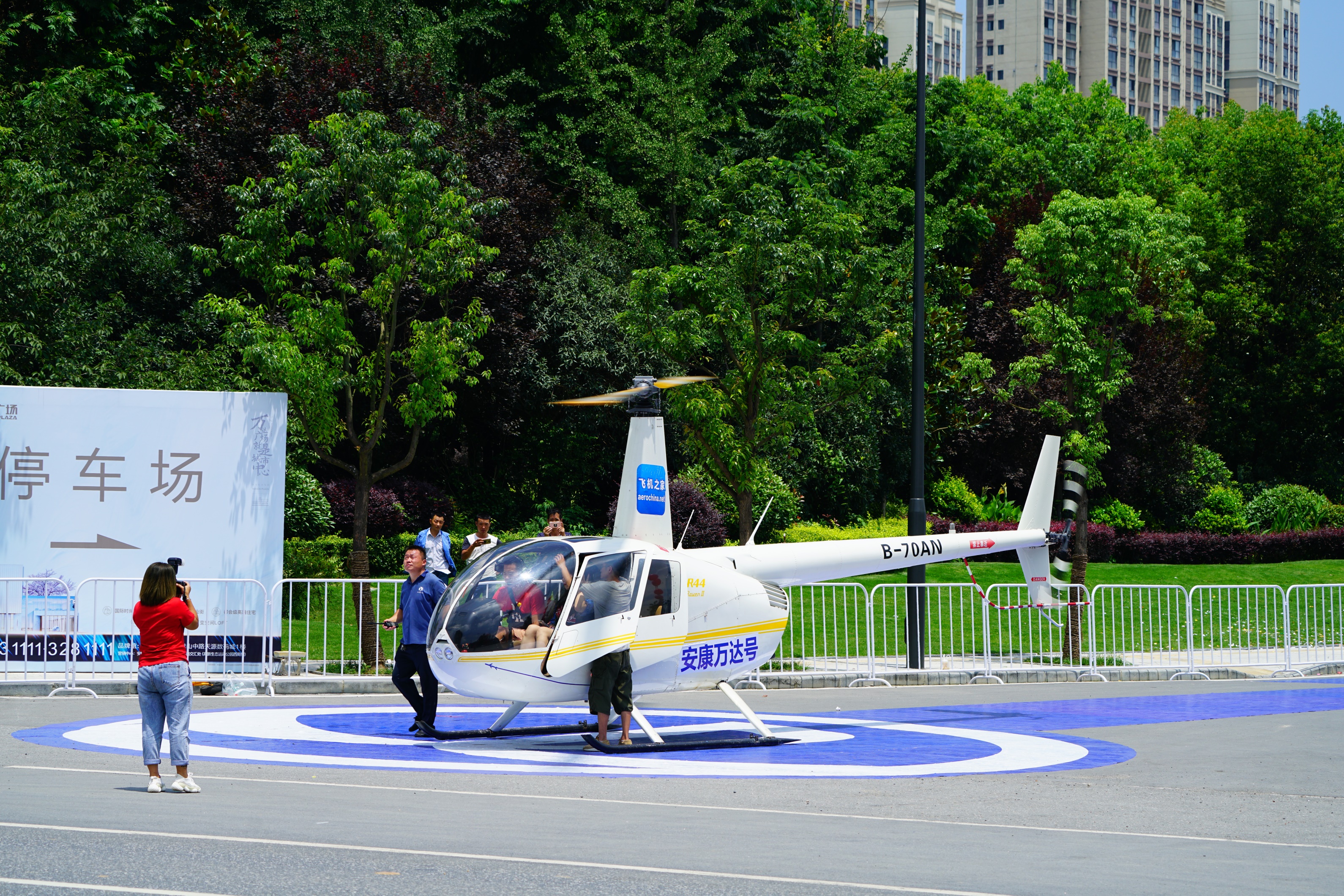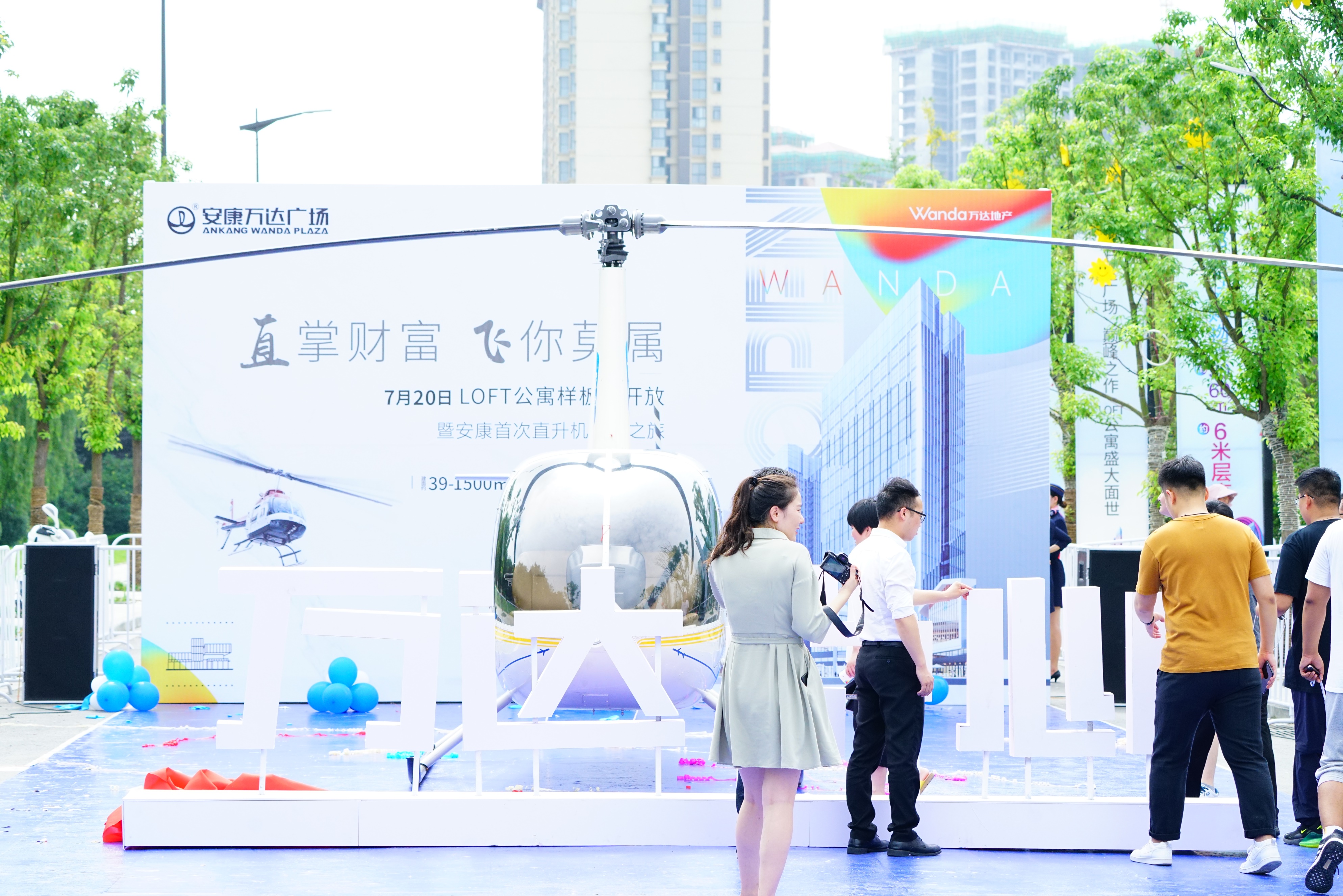 安康万达广场前,飞行员从直升机中走出,蓝色的画布铺在地面,过了一会,两名空模,一男一女装扮靓丽,站在直升机旁边给这次活动送上一道亮丽的风景。现场的蓝色、白色气球浮动在空中,粉红色丝带在风中轻轻摇曳,周围的人群都在不断抓拍留住美丽的一刻。