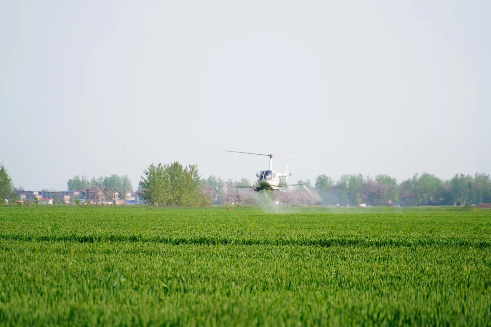 一架飞防直升机来回穿梭,在距离小麦数超低空中为小麦喷洒农药。飞机在驾驶员熟练的操控下,时而加速前行,时而近直角转弯,短短几分钟时间就完成了一大片麦田的农药喷洒工作。