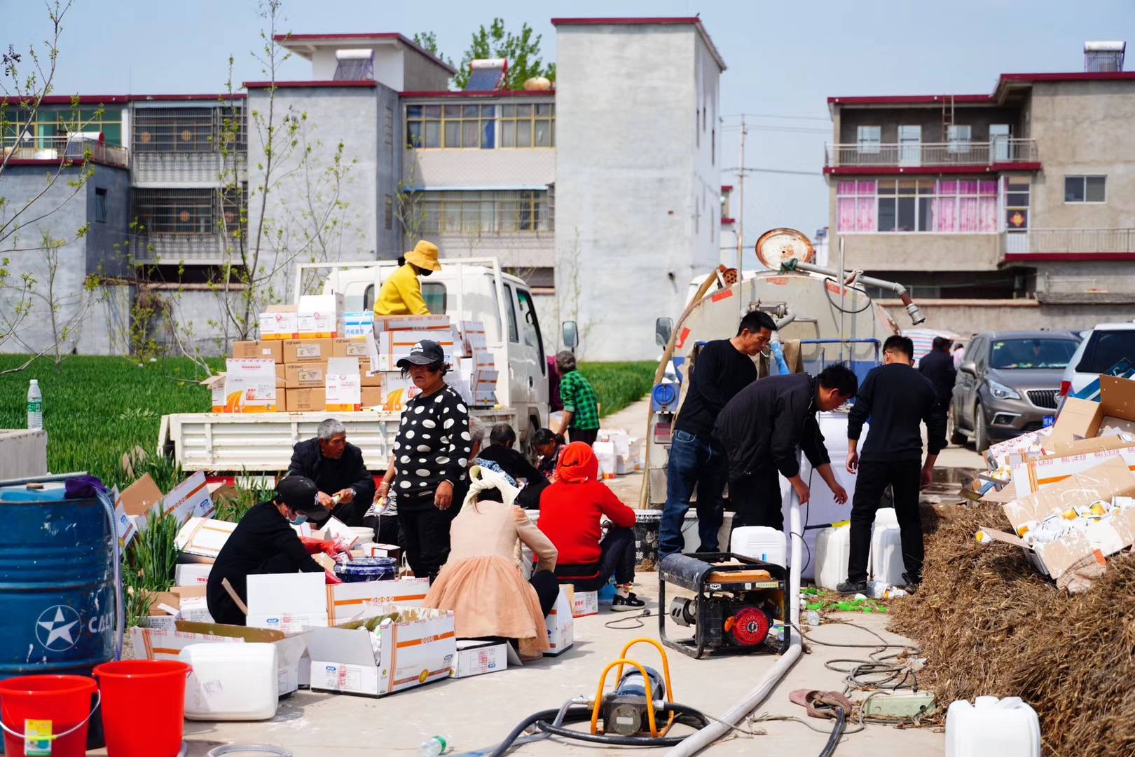 一辆大板车运载白色罗宾逊R44赶往安徽省工作现场。工作人员在当地居民的配合下进行设备的安装和调试,配置生物农药,清洗水管中剩余的药物残渣。检查水泵机工作是否正常、水罐车水量充足与否。现场一片繁忙,待前期工作准备充分后,接下来便是直升机闪亮登场了。